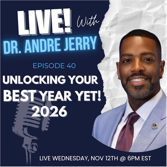 Episode 36: Better Late Than Never - Pt. 1 In this powerful and motivational episode of LIVE! With Dr. Andre Jerry, we explore the liberating truth that it's never too late to reinvent yourself, pivot toward purpose, or launch something new. Dr. Jerry unpacks the idea of "Better Late Than Never" through the lens of personal development, legacy-building, and digital entrepreneurship. From starting a YouTube channel to writing your first book, renewing your passport, or breaking free from toxic habits — this episode is filled with practical steps to help you move from procrastination to purposeful action.